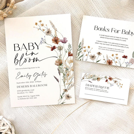 Baby In Bloom Invitation | Baby shower bundle | Books for Baby card | Diaper raffle card